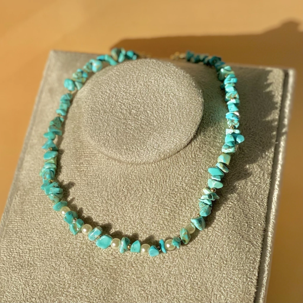 Descubra a sofisticação do Colar Antilopes, uma peça única que combina elegância e estilo. Este choker de cascalho turquesa é adornado com entremeios dourados e pérolas de ABS, proporcionando um visual deslumbrante e contemporâneo.