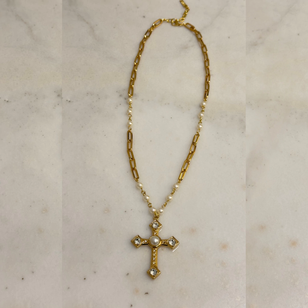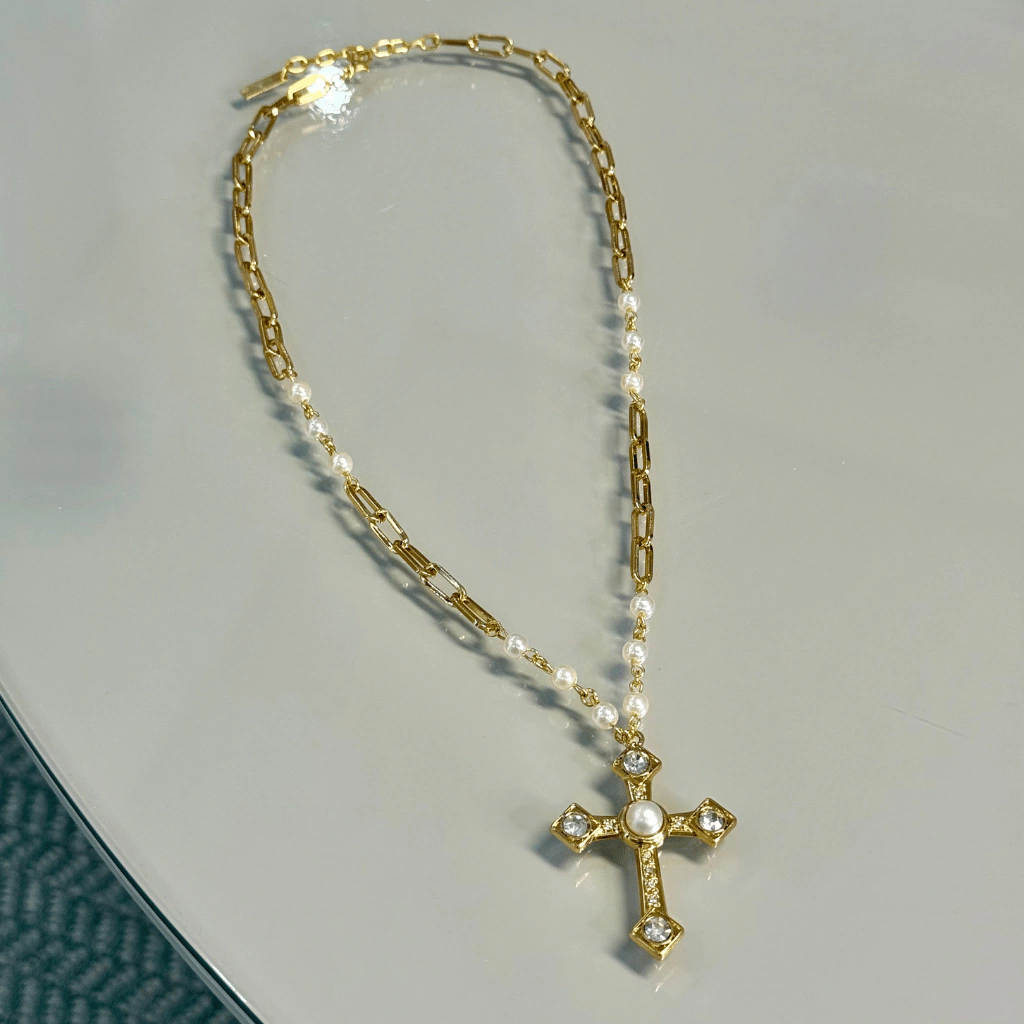 Confeccionado com corrente de elo alongado delicado, ele é adornado com pérolas de ABS artesanalmente produzidas pela técnica de alfinetes, conferindo um acabamento refinado e exclusivo. O pingente de crucifixo, ricamente decorado com pérolas e strass na cor cristal, oferece um toque de brilho sutil e requinte.