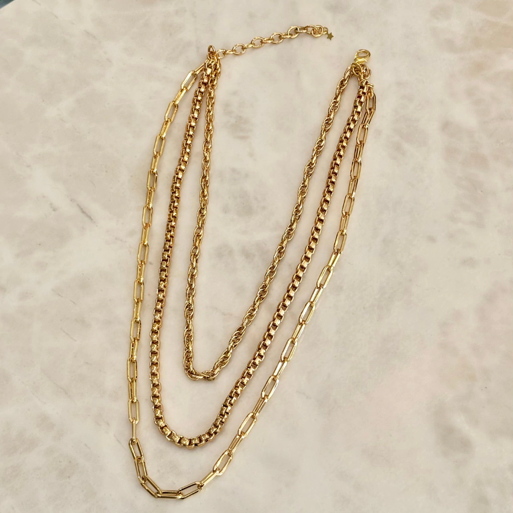 Colar com correntarias clássicas, elos redondos, entrelaçados e alongados.
