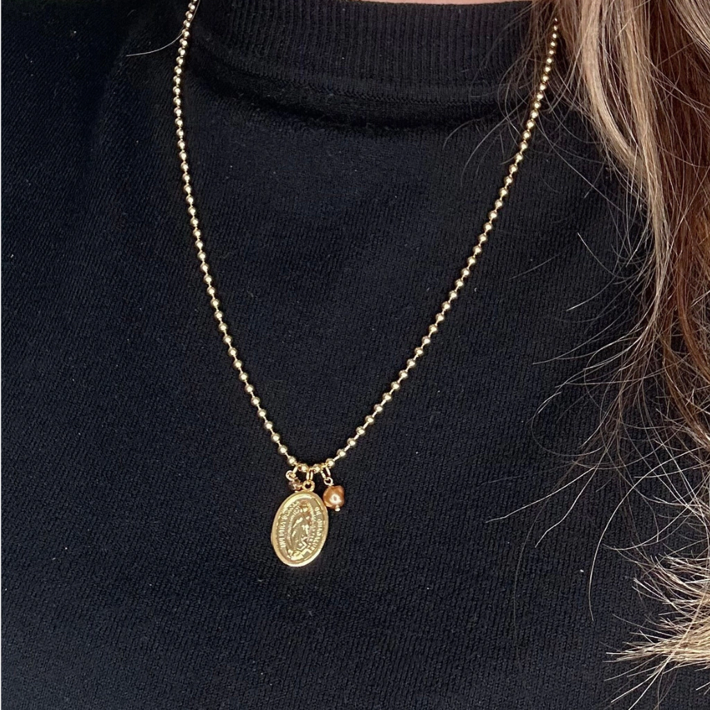 O colar Guadalupe II é uma joia sublime que integra a coleção "UNICA". Com um design sofisticado, este acessório é todo em metal, apresentando uma corrente clássica que exalta a elegância. O destaque fica por conta do pingente com a imagem de Nossa Senhora de Guadalupe, adornado por uma pérola natural tingida e um cristal delicadamente preso por um alfinete.