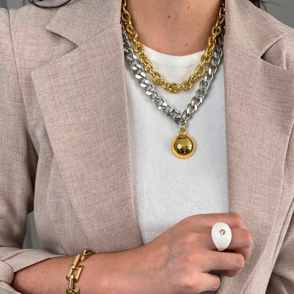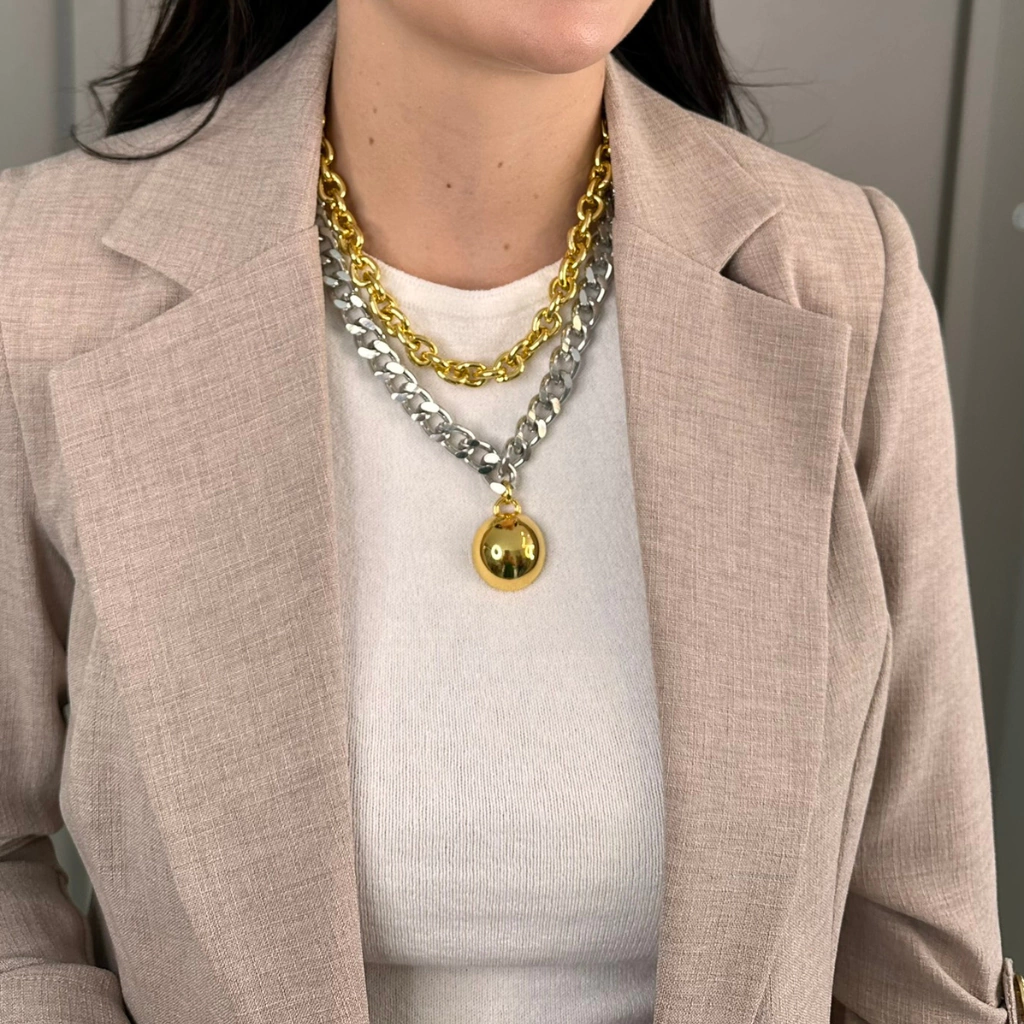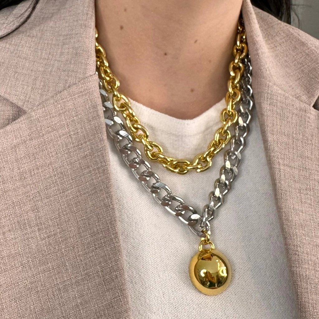 Descubra o Colar Natalia, uma peça artesanal que combina sofisticação e versatilidade. Composto por dois fios de correntes em um único fecho, o colar traz uma mistura harmônica entre o banho dourado em elos gota e o banho ródio branco nos elos grume, criando um visual moderno e cheio de textura.