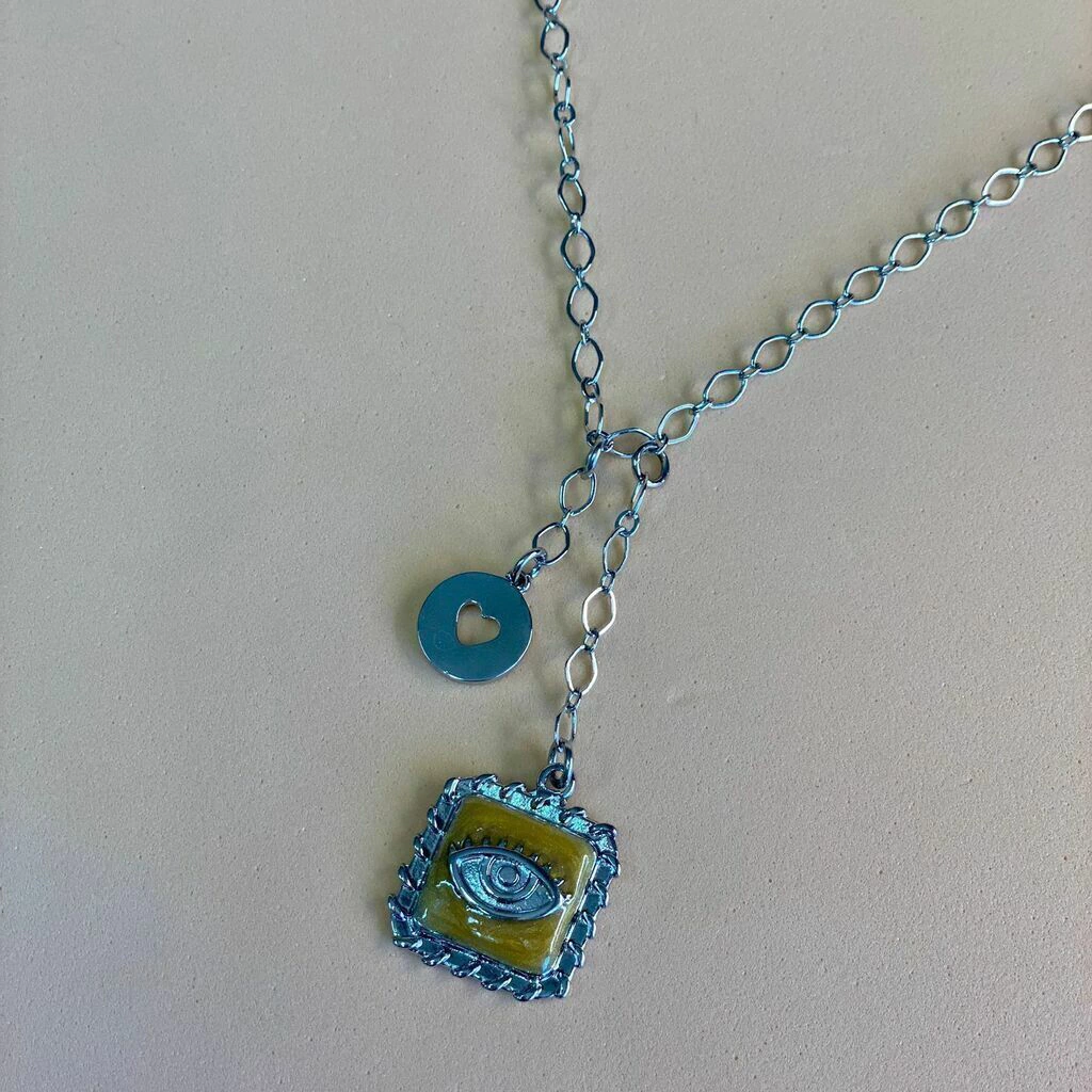O estilo gravata do colar é realçado por um pingente de olho grego com uma linda aplicação de resina dourada, simbolizando proteção e boas energias. Além disso, o pingente pequeno de coração traz um toque de amor e delicadeza, tornando-o ideal para qualquer ocasião.