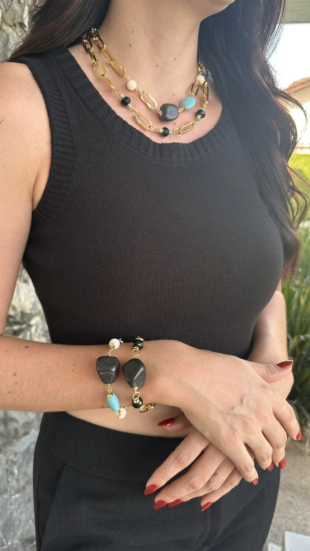 Pulseira Gabriella é uma peça da coleção "Alma" e faz conjunto com o colar Gabriella. Tras as mesmas composições em pedras e metais, tornando essa peça com